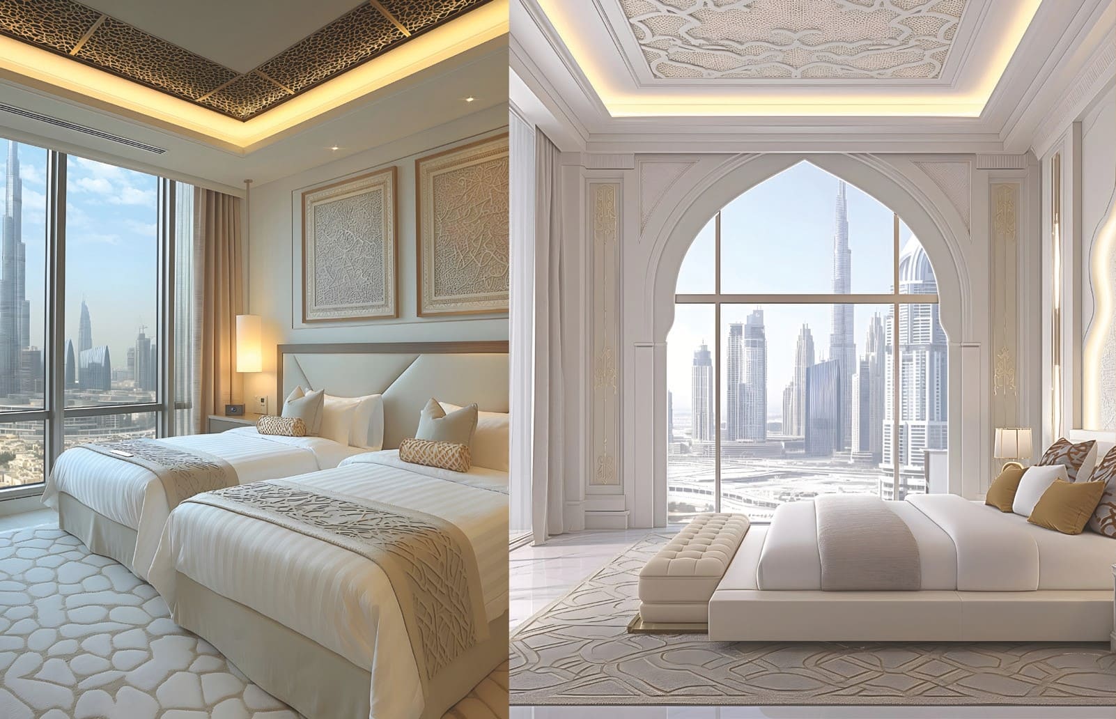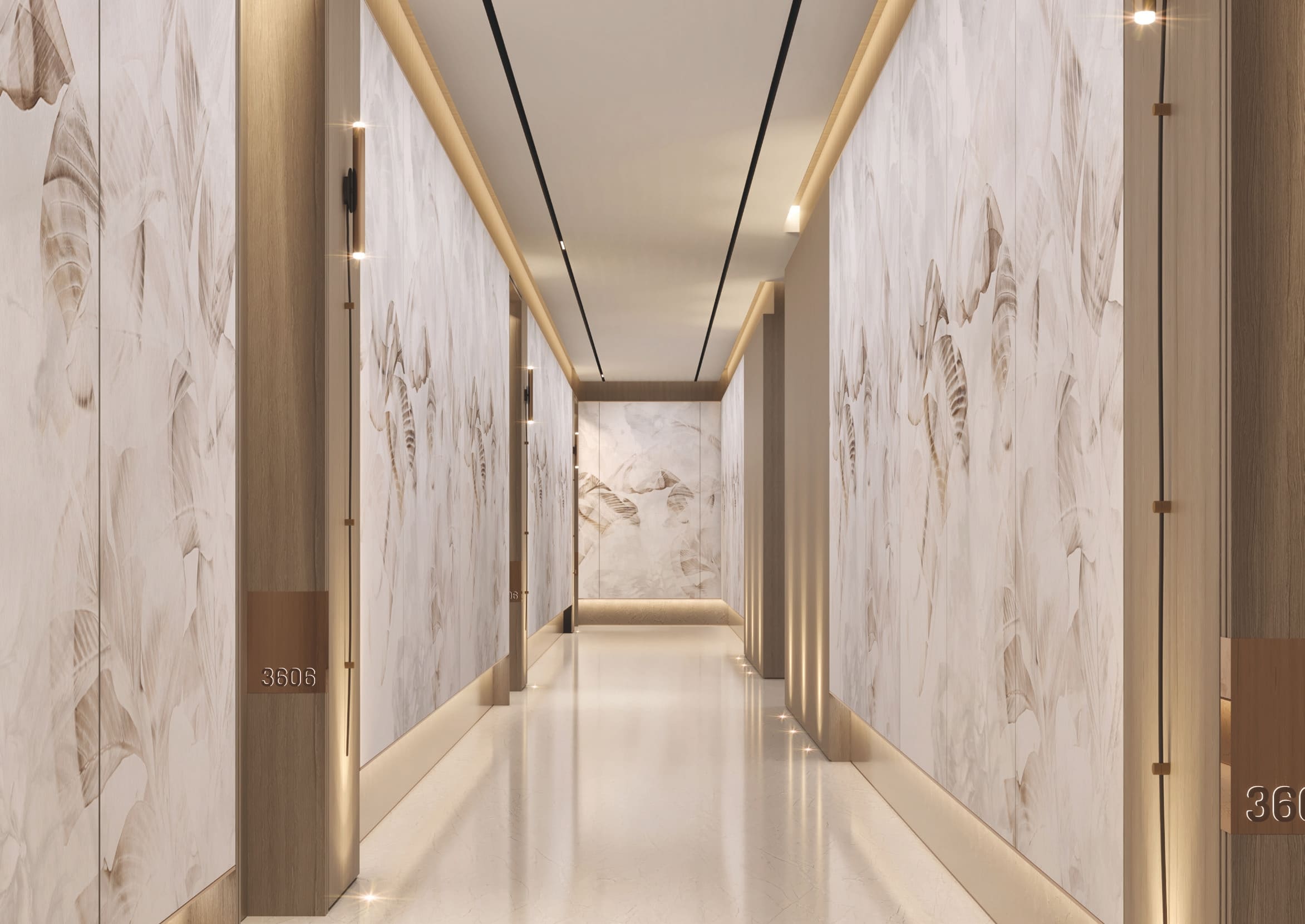 Modern finishing with high-quality materials. Light brown/tan fabric for furniture. White paint for walls and ceilings. Decorative luxury wallpaper with a white and beige pattern. Dark brown wood used for wall art. Light beige fabric for furniture. Light cream-colored marble for flooring